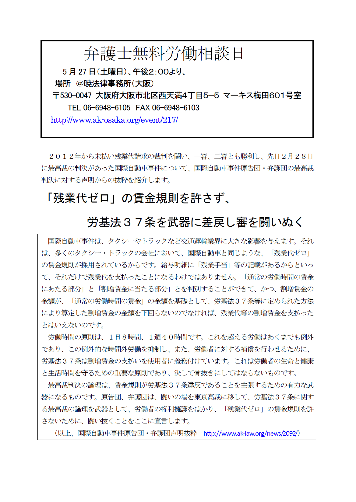 Kさんは「自分個人の問題でない。労働者が安全、健康に働くことができる労働者の権利の問題であり、労働者が、このような不当な扱いを受けないようにするために闘う」と述べています。Kさんの起ち上がりにご支援をお願い致します。